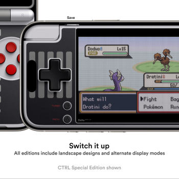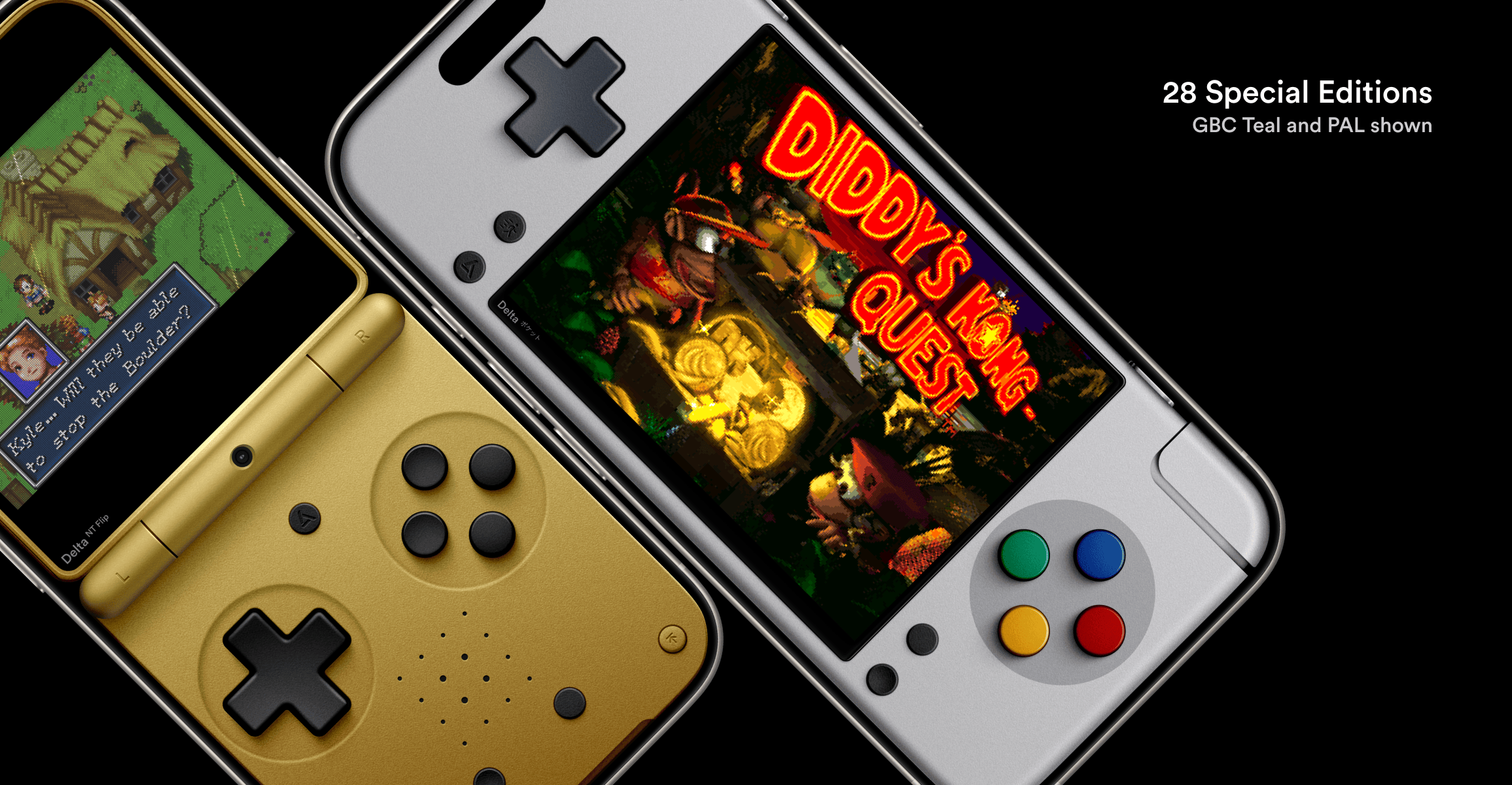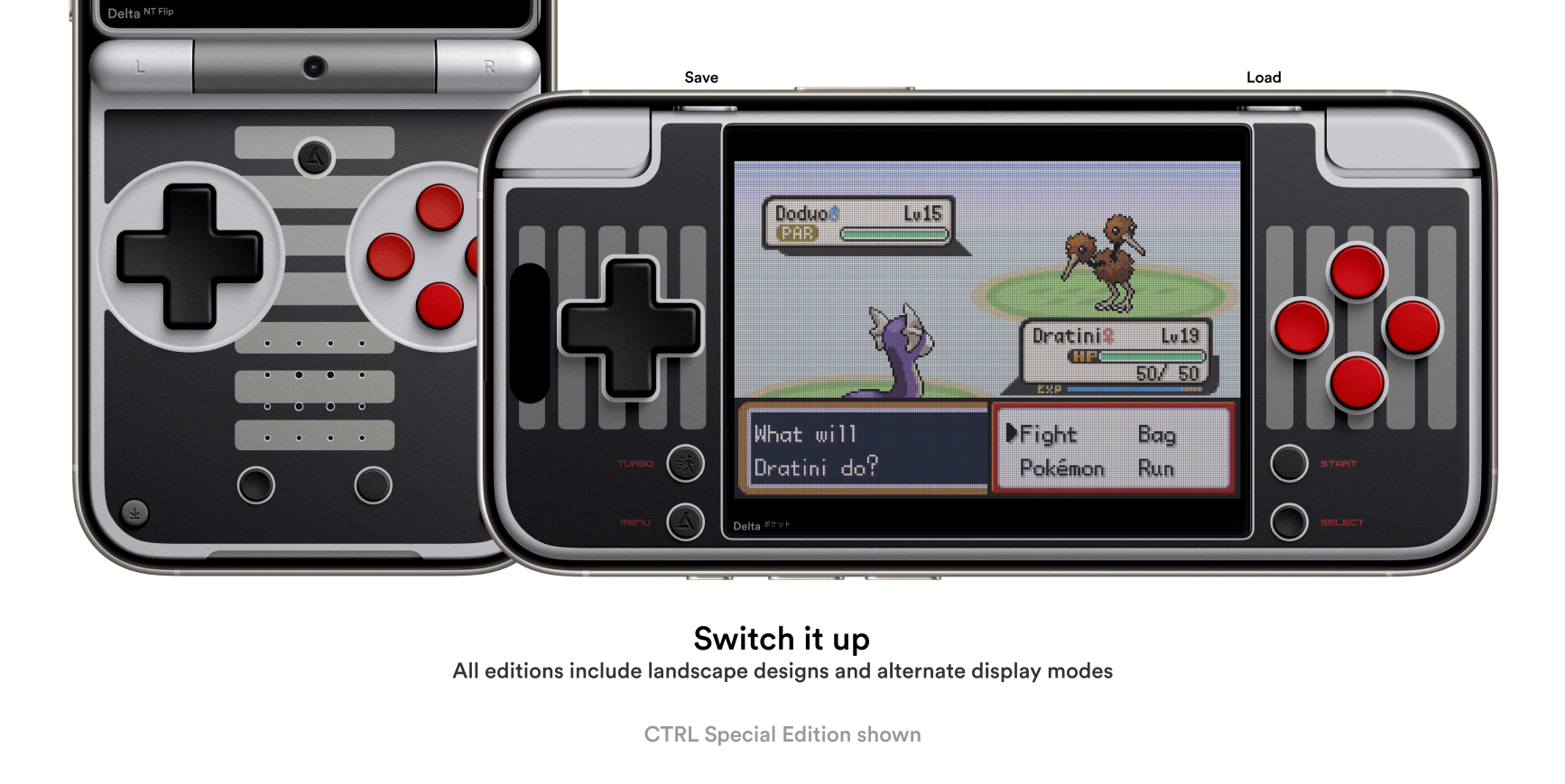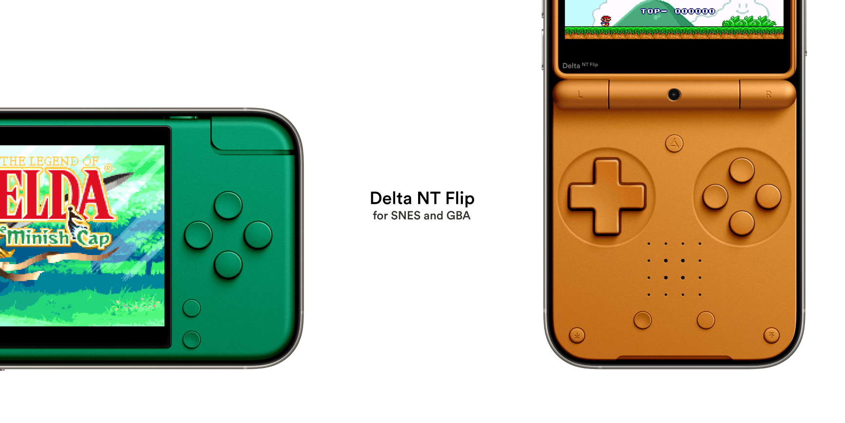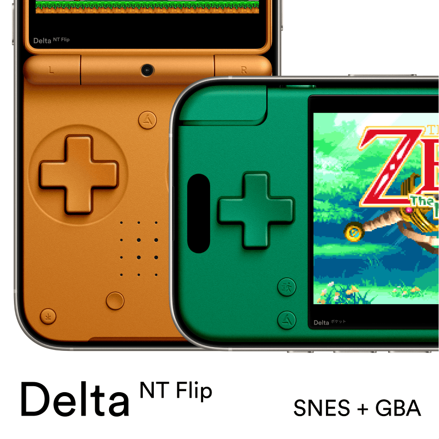 Delta NT Flip is a sort of cross between an Analogue Pocket, a 2DS XL, and a Game Boy Advance SP– built on the foundation of the Delta Pocket design! This preview includes the Orange edition for SNES, and the Green edition for GBA. If you love this layout, check out the full collection, which includes 14 Classic Colors, 28 Special Editions, and 12 Transparent Editions– all available for both SNES and GBA!