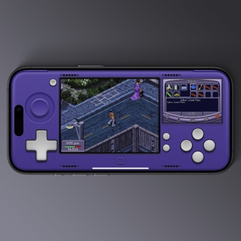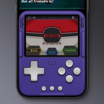 The design treats the top screen as an external display window while the bottom touch screen is integrated into the controller, creating the illusion of a unified hardware appearance.